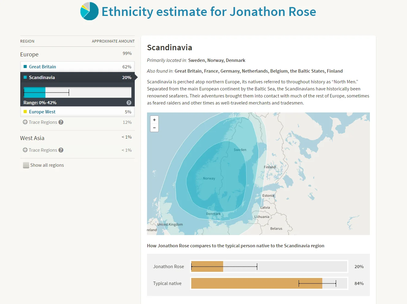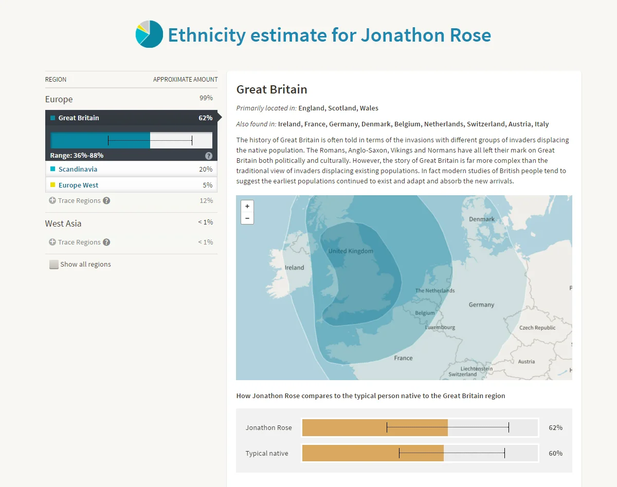 In the above web capture, you can see a breakdown of my ethnicity regions. Blimey! I'm 62% British! Hang on a second. I'm going to pump the brakes for a minute. You have to understand something first. The sample anyone sends off to Ancestry DNA is saliva. It's not blood. This is especially important with me because I've had a bone marrow transplant. And therefore, my blood has been changed from its original form. Altered, if you will. Don't worry, I'm not going to grow into an Indominus Rex and eat your face off. I'm still a boy, after all. But saliva, on the other hand is 99% me. So this data is 99% me. Indominus Jonathon of badassadom.